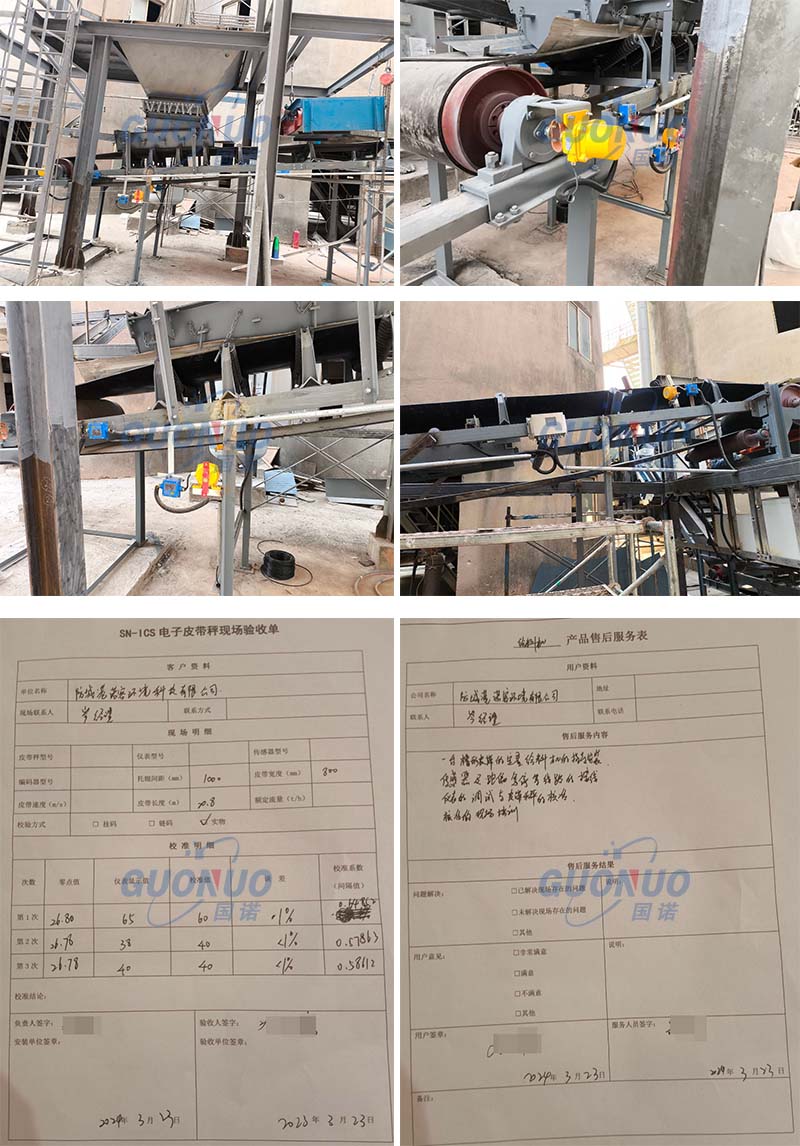 因現(xiàn)場(chǎng)工況比較復(fù)雜,公司安排經(jīng)驗(yàn)豐富售后工程師至現(xiàn)場(chǎng)安裝調(diào)試。工程師至現(xiàn)場(chǎng)后,首先清點(diǎn)物料,與現(xiàn)場(chǎng)負(fù)責(zé)人確認(rèn)安裝時(shí)間和計(jì)劃。確認(rèn)物料無誤和安裝規(guī)劃后立即著手安裝,首先完成所有拼裝、接線以及通電。在變頻器5hz,帶速0.1m/s的情況下完成零點(diǎn)校準(zhǔn)及砝碼實(shí)物校準(zhǔn)。多次校準(zhǔn)結(jié)果合格后,對(duì)現(xiàn)場(chǎng)人員進(jìn)行培訓(xùn),內(nèi)容包括定量給料機(jī)控制柜的接線接點(diǎn)、儀表的調(diào)試及校準(zhǔn)步驟、零點(diǎn)與實(shí)物校準(zhǔn)的方法和計(jì)算。